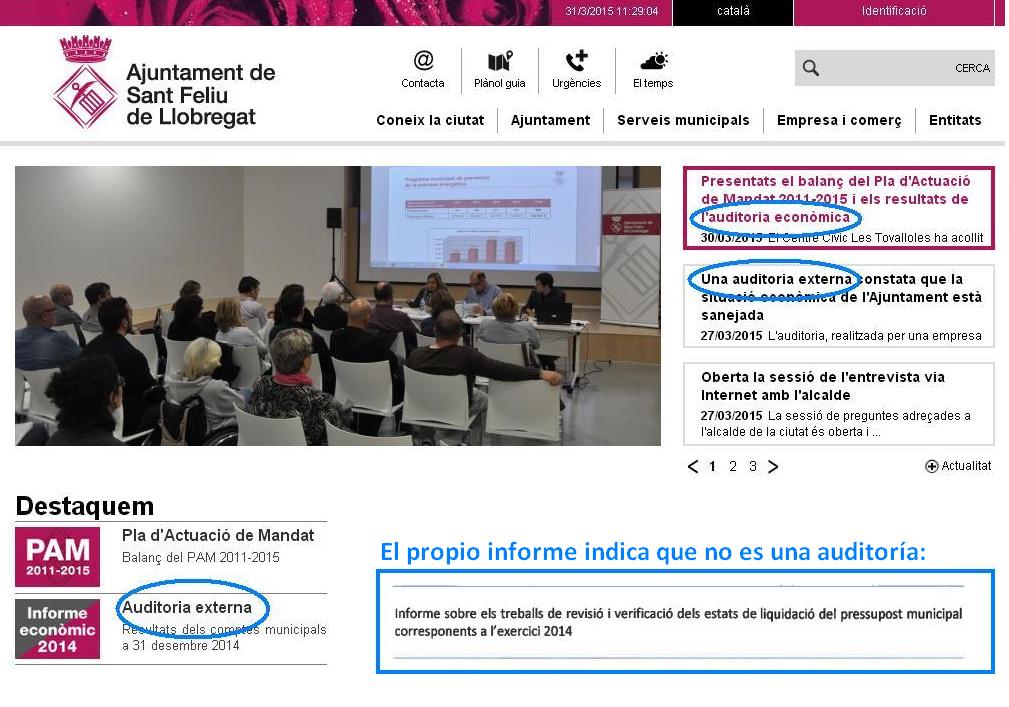 En el pasado pleno quedó claro que no se ha pedido una auditoría externa ya que legalmente no se puede. Se ha pedido un informe sobre los trabajos de revisión y verificación de los estados de liquidación del presupuesto municipal correspondientes al ejercicio 2014. Aún así la web del Ayuntamiento de Sant Feliu de Llobregat indica hasta en 3 ocasiones publicitando una auditoría. Esa es la imparcialidad de los medios de comunicación públicos de nuestra ciudad.